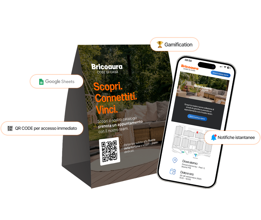 Con il Pack Fiera-Ready hai a disposizione una landing personalizzata, QR Code e strumenti digitali plug-and-play per raccogliere lead in tempo reale durante la fiera.